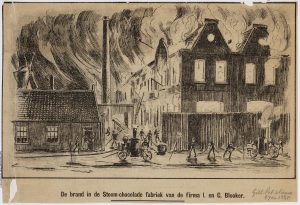 Prent van de brand in 1885, stadsarchief Amsterdam en de fabriek in de jaren ’30, foto Peter Louw